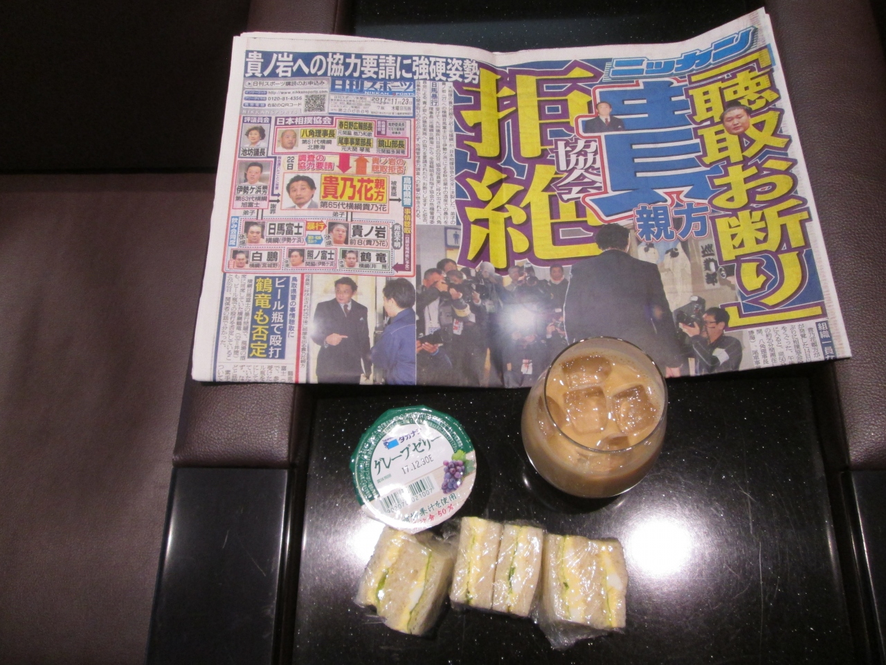 自宅で飲食せずに起床してから羽田空港に直行。ラウンジに朝食用メニューがあるので、ラウンジで朝食を取りました。サンドイッチは一口サイズのタイプですぐに食べれました。コーヒーメーカーで作ったコーヒーも香り豊かでおいしかったです。