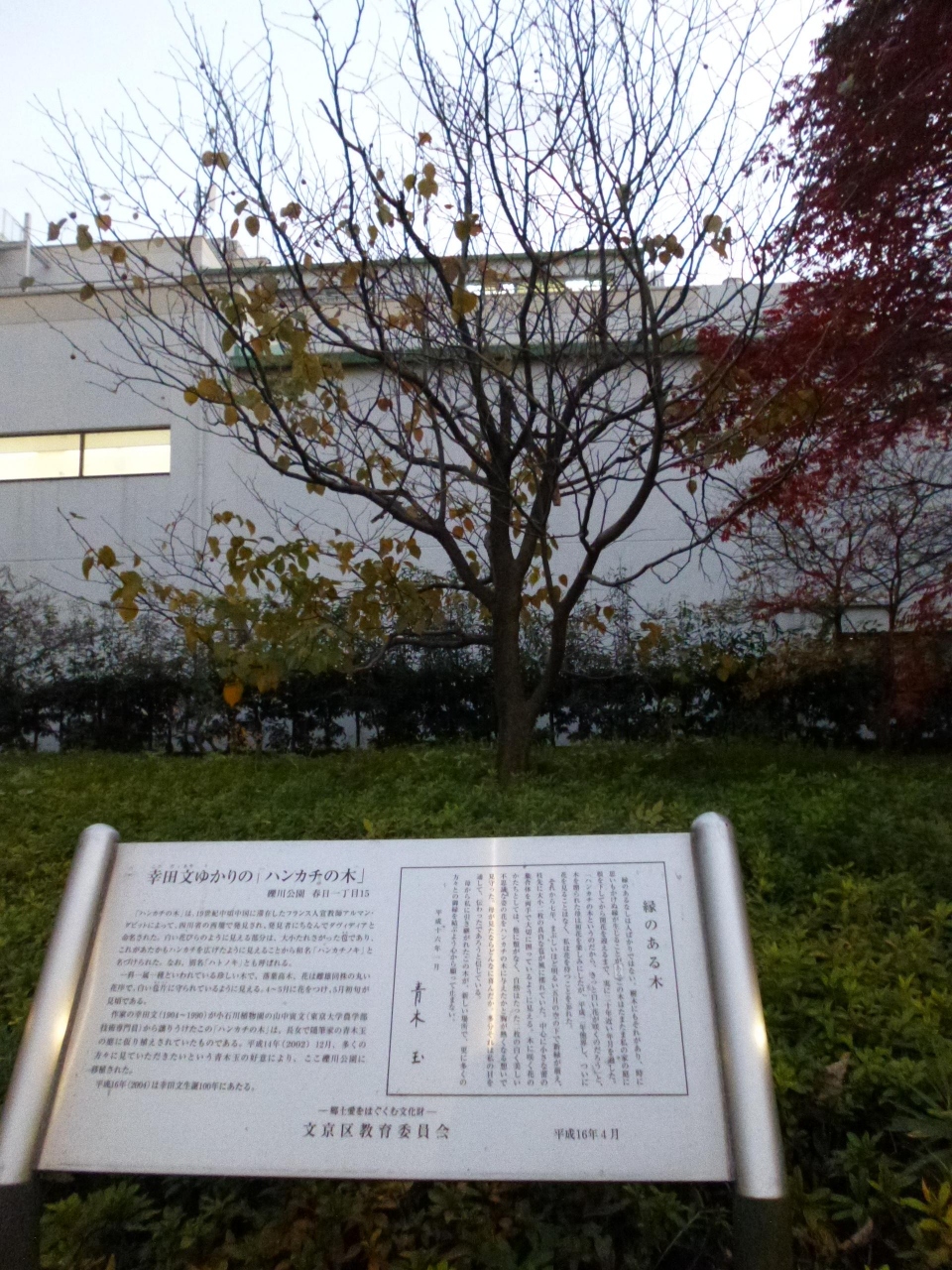 丸の内線後楽園駅を出てすぐのところにある、礫川公園。公園に一角に、文京区ゆかりの作家が作品に描いた2本の木があります。「ちいさい秋みつけた」のハゼの木は、燃えるように真っ赤でしたが、ハンカチの木は、葉もほとんど落ちてしまって、寂しい感じでした。4月に咲く、ハンカチのような花を是非、見にきたいと思いました。