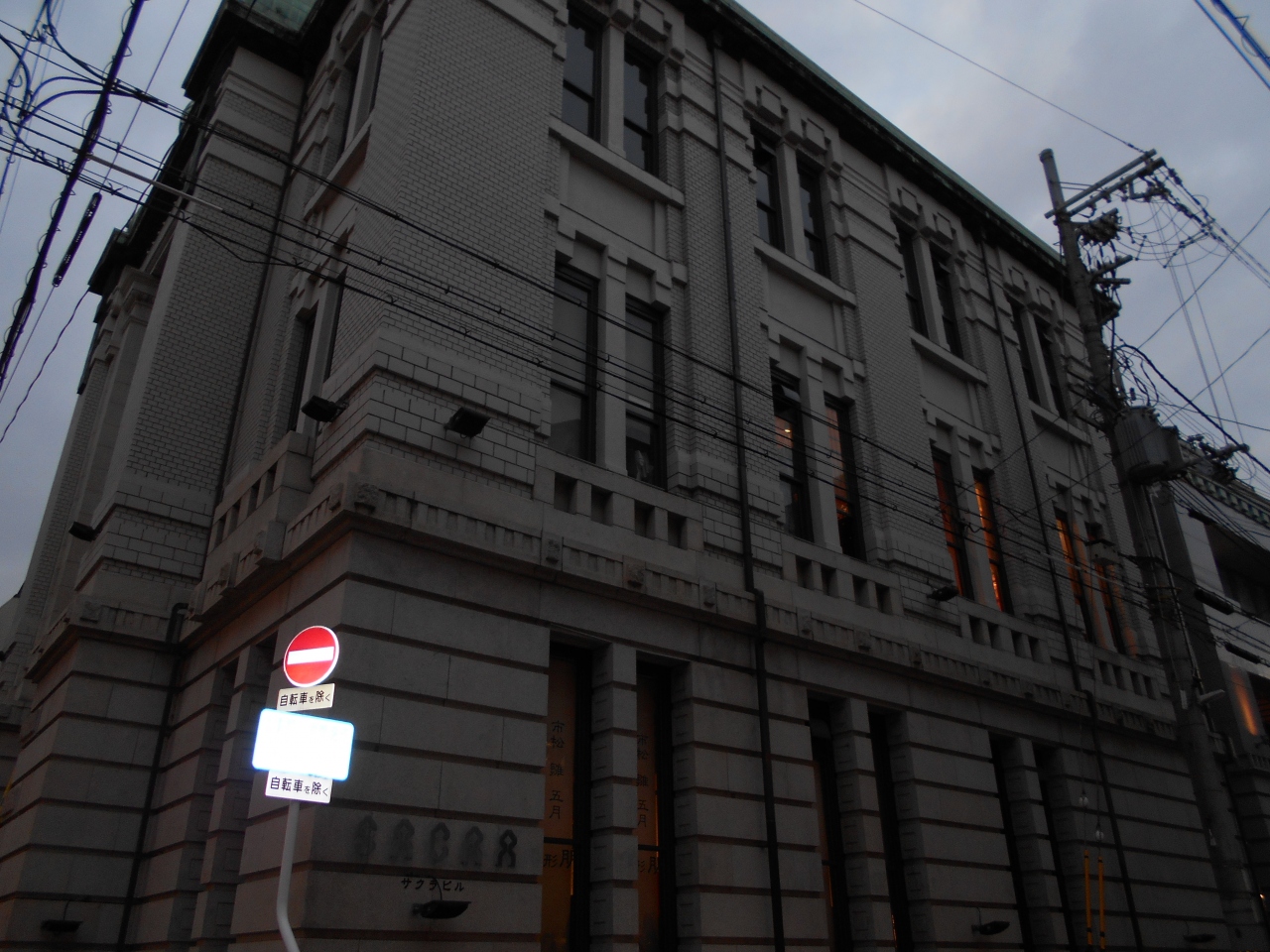 1928ビルと同じ三条通りにあるテナントビルです。不動貯金銀行の京都支店から、ファッションテナントのビルとしてリニューアルされた建物です。大正4年に建てられました。1階が煉瓦造,2・3階が木骨煉瓦造で造られています。外観は全体としてルネサンス風ですが,部分的に幾何学的なもようのモダンデザインです。国登録有形文化財です。すっきりシャープな印象を受けました。