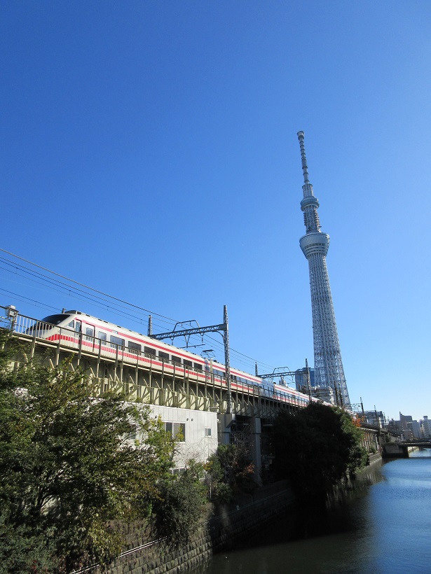 墨田区役所の裏手にある橋で、ここからはスカイツリーとその横を走る東武線を眺めることが出来ます。源森橋に近い歩道を歩いていた際に、ちょうどスカイツリー駅から東武線が発車してゆっくりと隅田川に向かって来たところを一枚。雲一つない空をバックに良い写真(自己満足と笑ってください)が撮れました。