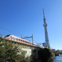 墨田区役所の裏手にある橋で、ここからはスカイツリーとその横を走る東武線を眺めることが出来ます。