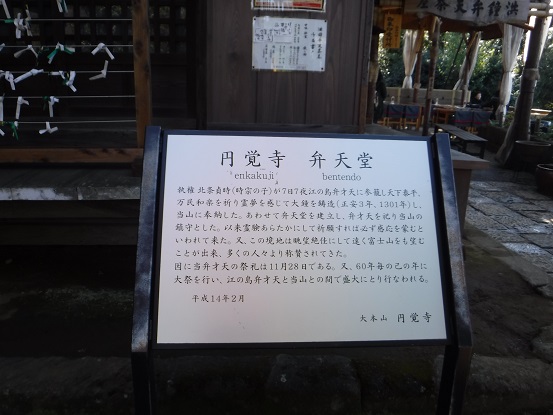 洪鐘を見ようと途中へたばりながら長い階段を上って行くと、洪鐘の隣に小さなお堂があることに気づきました。執権北条貞時が国家安泰を祈願した鐘を鋳造させようとしましたが、上手くできないので江の島弁財天に参籠したところ、夢のお告げのとおりにしたら上手く鋳造できたので、江の島から弁財天を招来しこの山の鎮守にしたそうです。とても景色の良いところなので、洪鐘と弁天堂と茶屋のセットがおすすめです。