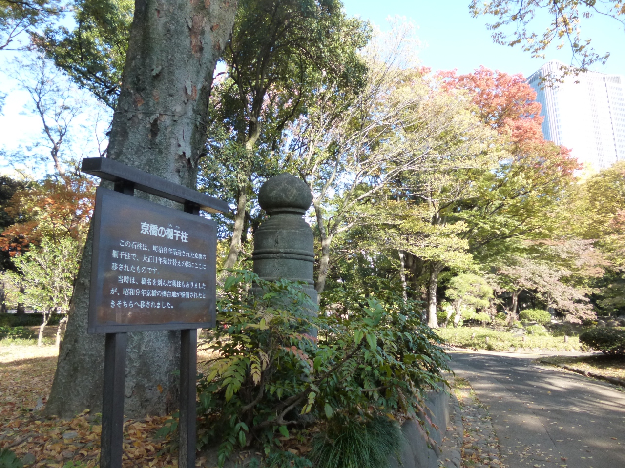 日比谷公園に菊花の鑑賞会を見に行きました。素晴らしい大輪の菊を鑑賞した後、鶴の噴水のある池の方へ歩いていくと、京橋の欄干柱が展示してありました。明治8年に造られた欄干ですが、実際の橋のところにあった方が、デザインの美しさがわかるように思いました。