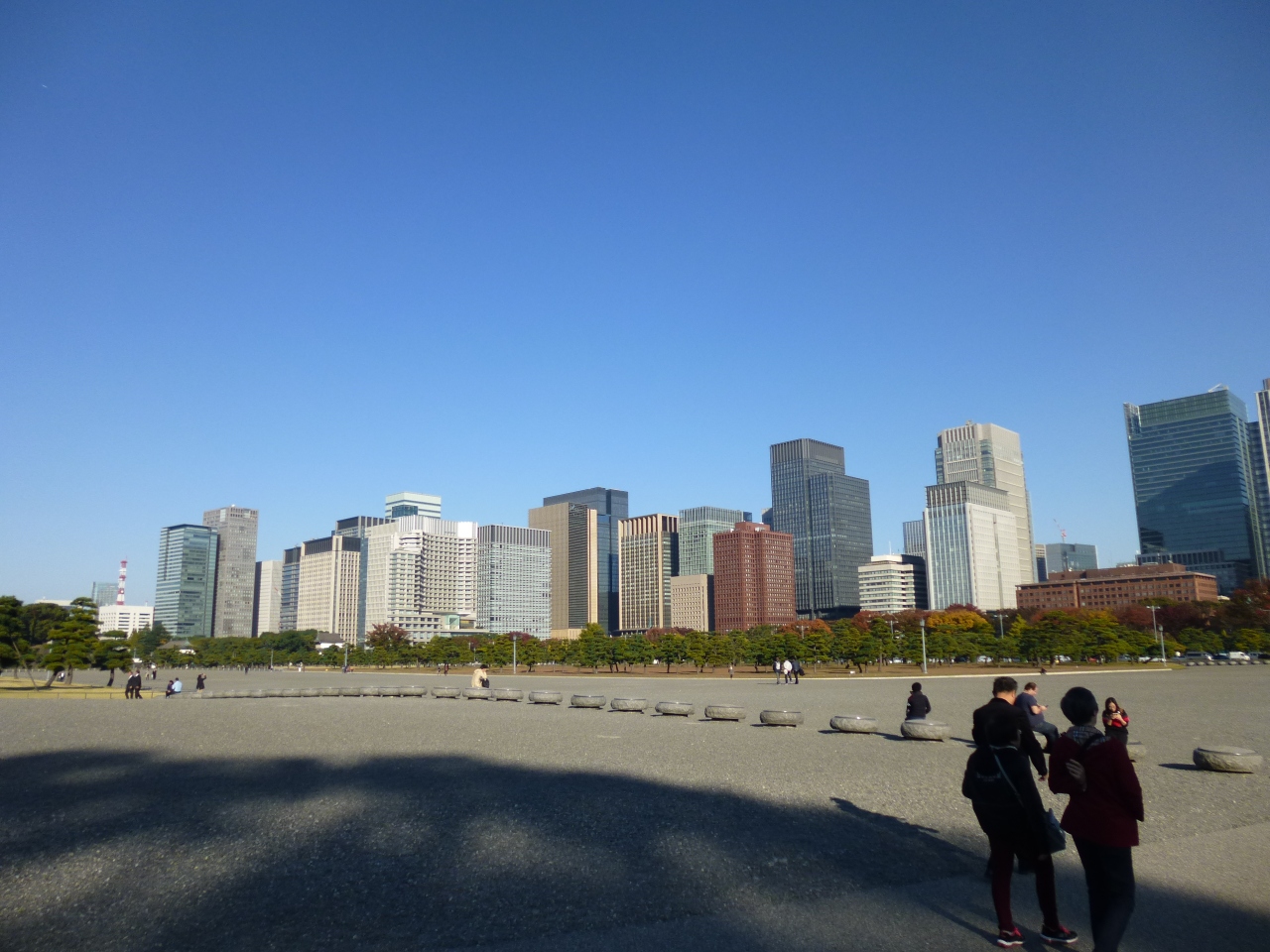 正門石橋を眺める、東京の代表的な風景の一つがこの場所だと思います。多くの観光客や遠足の小学生が訪れて、橋をバックに写真を撮っていました。広場をはさんで反対側には、外堀の向こうに並ぶビルの姿が、青空に美しいです。どちらも、東京らしい風景だと思います。