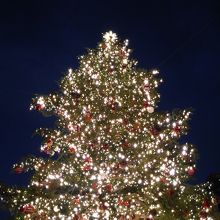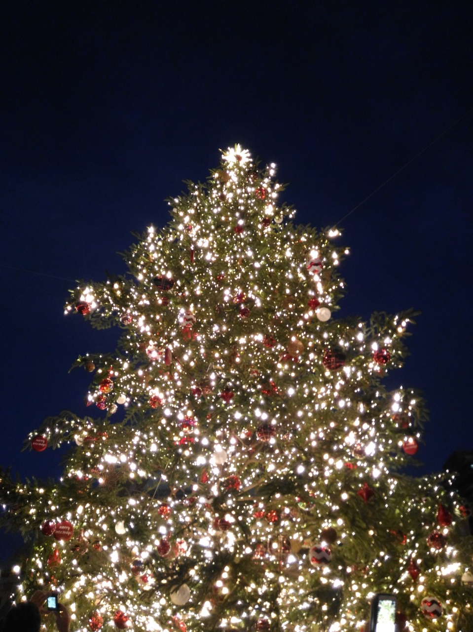高い木に暖色系のライト、クラシックなオーナメントが癒されます。