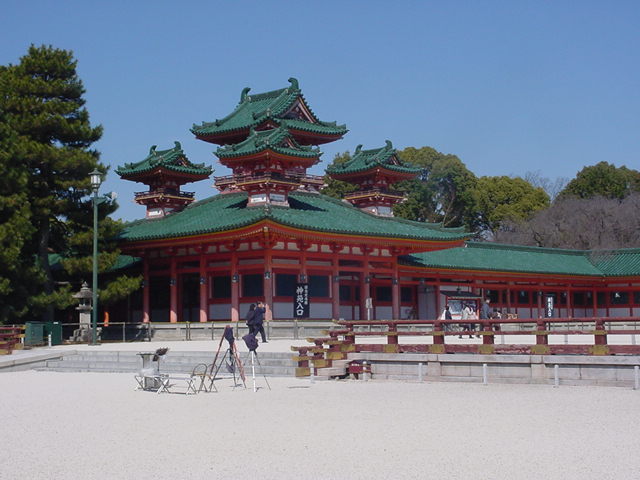 平安神宮の中心となる建物が太極殿ですが、向かって左手(西側)にあるのが白虎楼です。東側にある蒼龍楼と対になっていますが、白虎楼は神苑への入口にもなっています。朱塗りの柱と緑色の屋根が印象的です。この近くで団体の記念写真を撮っていました。