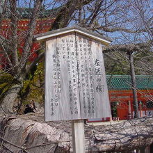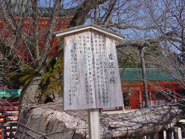 平安神宮には2本の古木が太極殿の前にあります。右近の橘は養生中なのか、囲いの中に覆われていましたが、左近の桜は見ることができました。とはいえ、3月上旬ではまだ桜には早かったようで、枝しかありませんでした。説明板には本居宣長の歌が詠まれていました。