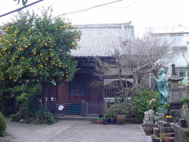 静かに時間が流れている谷中1丁目。お寺が密集している一角にありました。門は風格があって、瓦も重厚でした。境内は狭いですが、本堂は歴史を感じる造りです。そして堂の前には、冬なのに柑橘類がたくさんの実をつけていました。