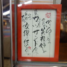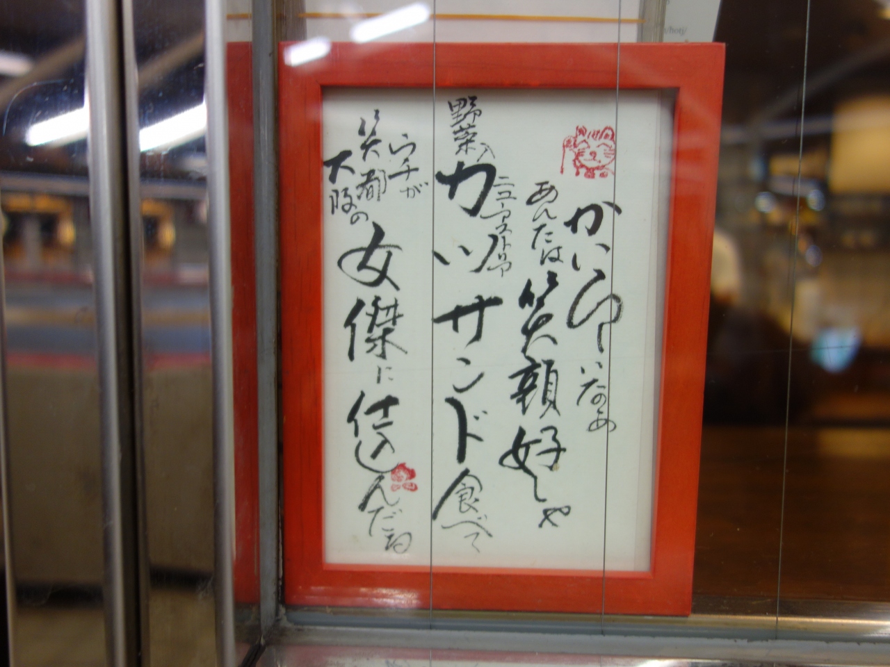 千里中央駅(ほぼ構内)にあるカツサンド屋さんです。オヤジさんが数人(4人?)でやっています。分業が徹底していて,言葉なしに流れ作業で次々とカツサンドが作られます。野菜入りと野菜なしの2種類がメインです。芥子もほんのり効いていて大人向けでしょうか。一口用に切れていますので,がぶつくのに便利です。地元に人に愛されているお店です。