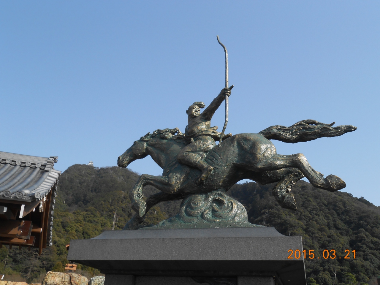 有料駐車場近くの入口には、馬に乗った若き日の信長公の像があります。