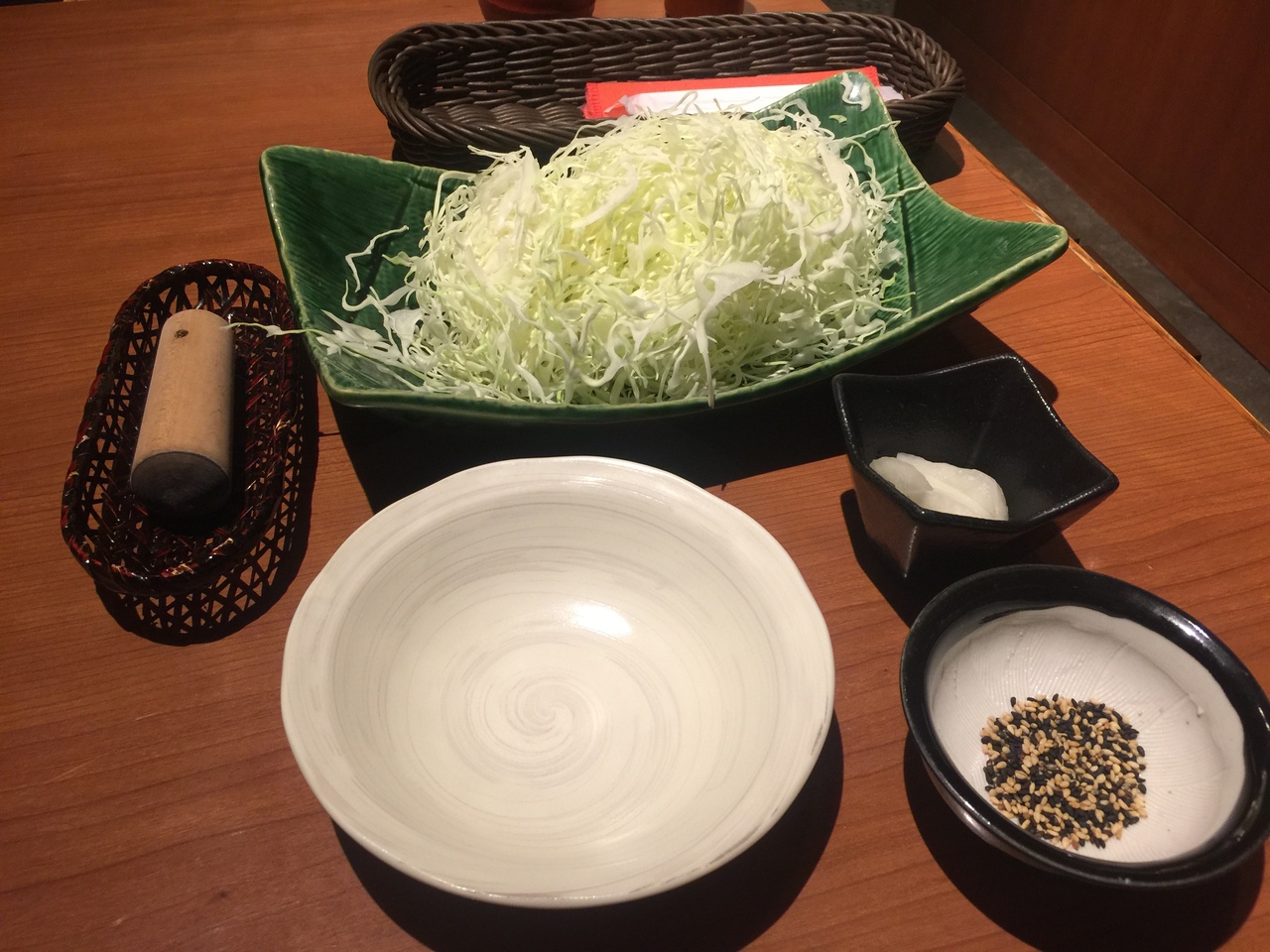 キャベツ、味噌汁、ご飯はおかわり自由です。ご飯は白米か麦ご飯が選べます。