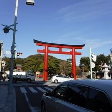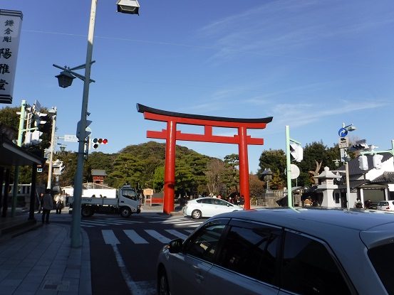 若宮大路を真っ直ぐ進むと突き当りにある朱塗りの大きな三の鳥居から鶴岡八幡宮の境内になります。現在の鳥居が建つ前は、関東大震災で倒壊してしまいましたが、徳川家綱が寄進した石造りの鳥居だったそうです。鳥居の前には信号があり車の往来も激しいので、鎌倉時代や江戸時代の参道周辺を想像するのは難しいです。