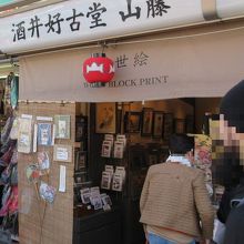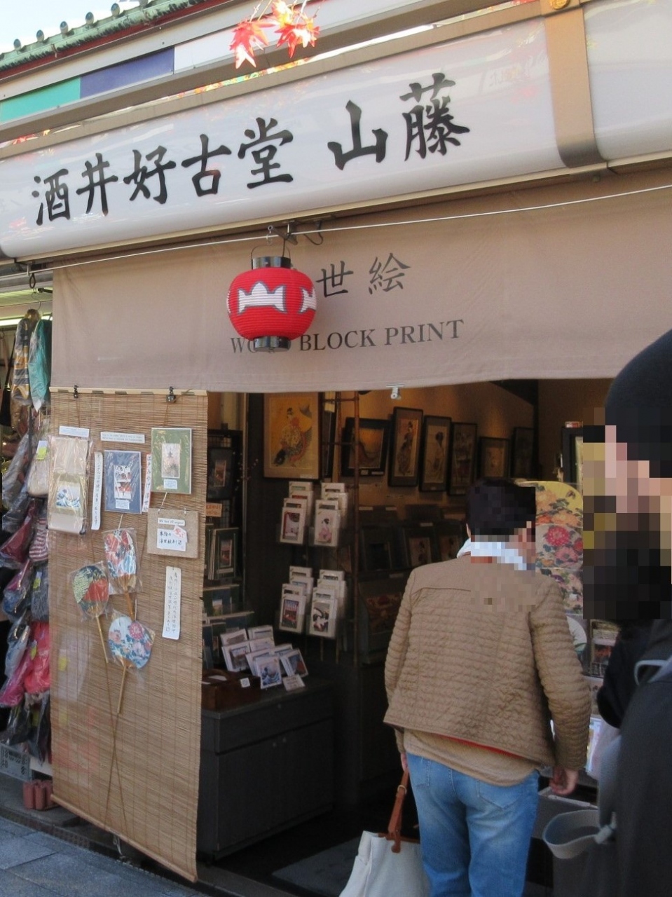 雷門をくぐって仲見世通りを進んでいくと、浮世絵やそれをモチーフにしたお土産物を販売する専門店の「山藤」がありました。海外、特に欧米からの旅行者には新鮮に映るようで、何人もの旅行者が足を止めて品定めをしていました。絵葉書や小物もあるのでばらまき用のお土産として重宝します。