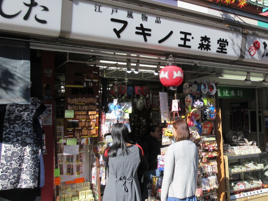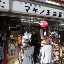 仲見世通りを進んでいくと「マキノ玉森堂」という小物を扱うお店がありました。とても狭い店ですが、一歩足を踏み入れるとお土産に丁度よいキーホルダーや手のひらサイズの小さな置物、アンパンマンのお面などが置かれていて、若いお嬢さんなどが「ねえこれかわいくない?」などと会話しながら品定めをしていました。