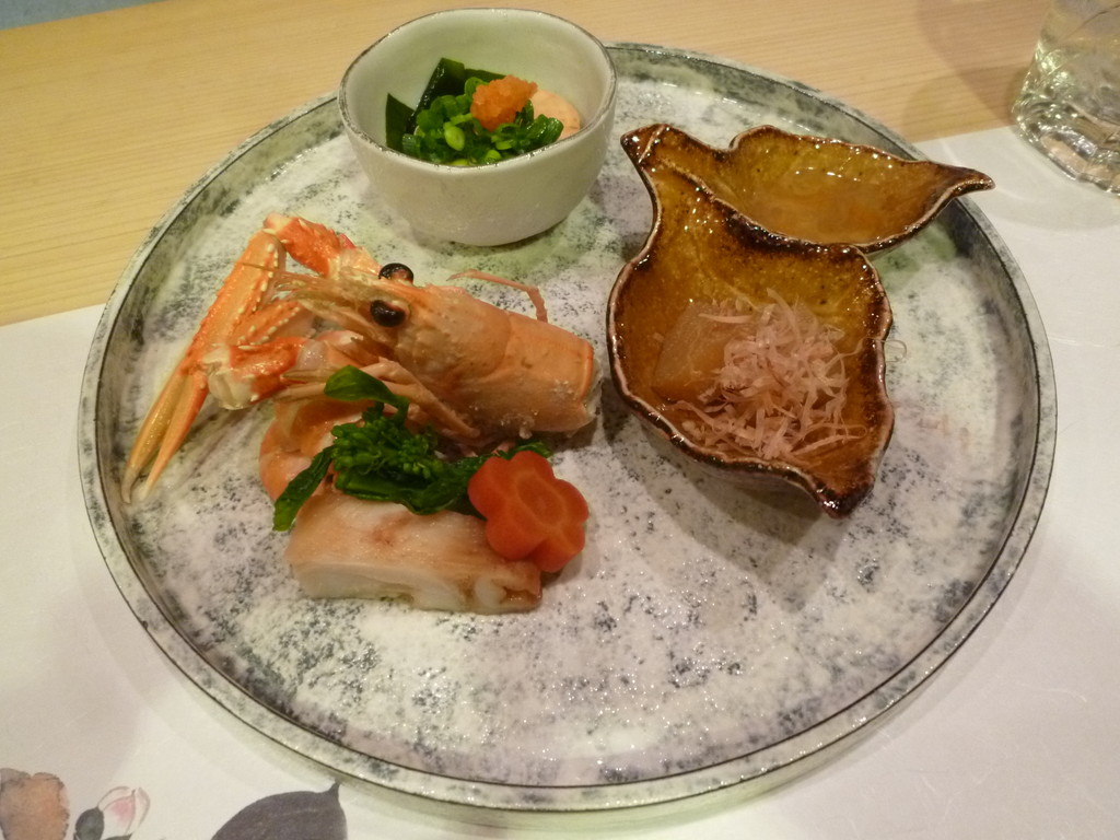 先付は、菜の花&あん肝、手長蝦など、お吸い物は鴨肉。