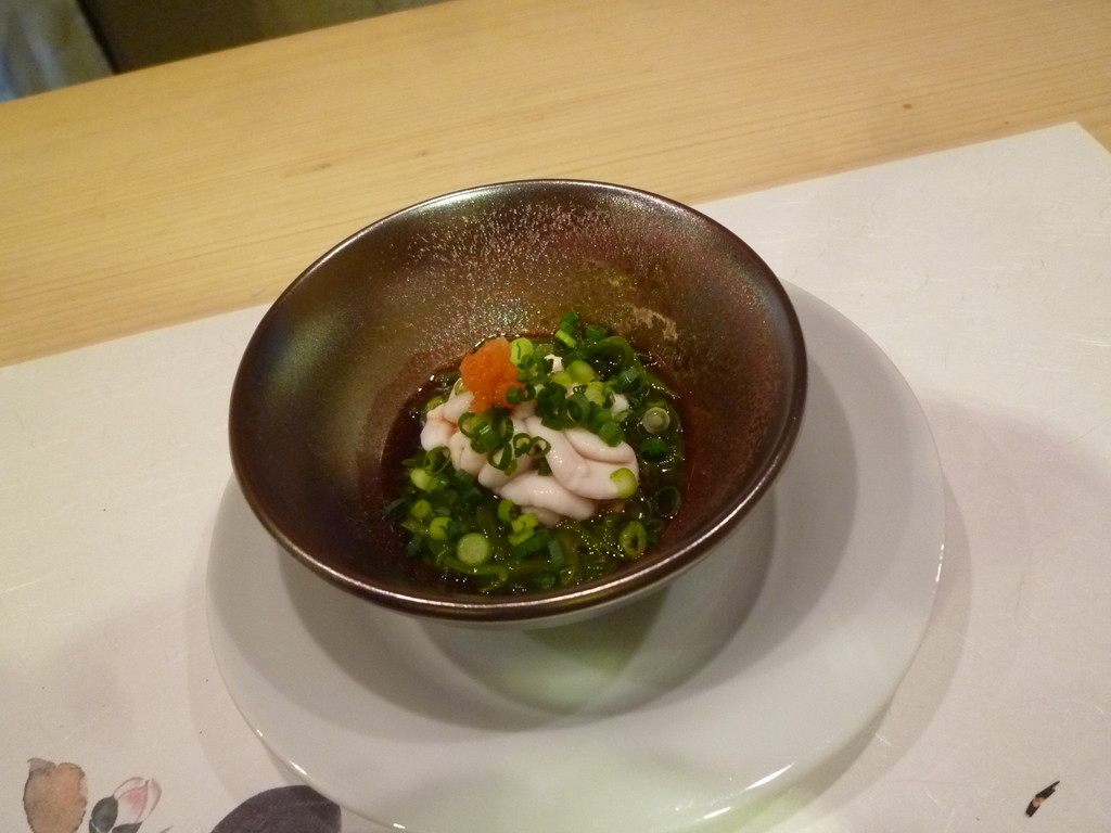 中学の親友に連れられて来ました。ここは、友人の馴染みのお店で、新橋駅烏丸口から徒歩7分の所にあります。店内に入ると、木製のカウンター席があり、奥にテーブル席がありました。我々は友人の指定席の奥のカウンター席に座りました。清潔感のあるお店で、料理も満足できる味でした。注文は友人にお任せ、コース料理を頼んでくれました。料理を出すときに、ご主人から簡単に料理の説明をしてくれました。