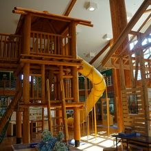 県民の森の管理棟みたいな位置づけはふれあい学習館。岩手山の自然を紹介するパネル展示などもありますが、ちょっとびっくりなのは本来は屋外にある木製のフィールドアスレチックスの遊具が室内に設置してあること。これなら雨の日もここで十分楽しめる。大胆な発想の仕掛けだと思います。