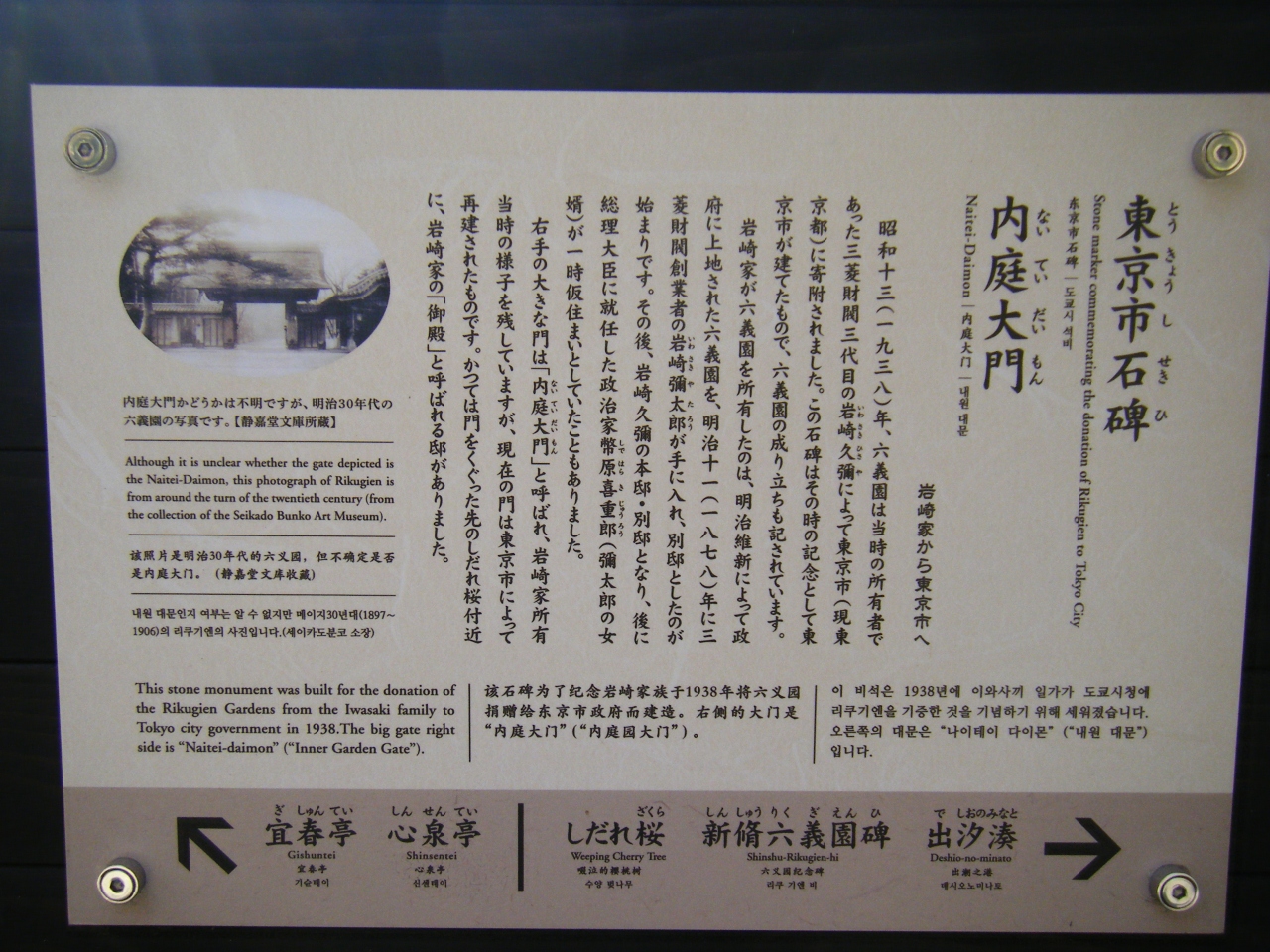 六義園の正面入口から入って少し左手奥に進んだ場所にある、いかにも歴史の古そうな門です。六義園は旧三菱財閥三代目の岩崎氏所有のものでしたが、昭和13年に東京市に寄付されたました。この門は当時の岩崎家の門の様子を残しているそうですが、現在の門は東京市によって再建されたものとの事です。東京市によって再建されたということは東京市が廃止となった1943年までには造られたものということでしょうか。1944-45年の戦災を免れたということなのでしょうね。趣があってよかったです。