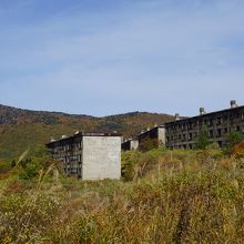 少し山を越えると突然現れる廃墟の建物群。近づけませんが、道路からはっきり見えて壮観。かつての賑わいが偲べます。一方で、ここからだと八幡平の眺めもいい感じ。一見の価値はあるでしょう。