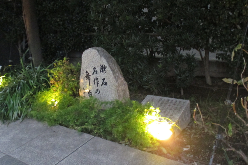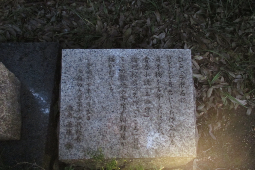 日本橋と聞いても寄席は思い浮かびませんが、COREDO日本橋と東京西川の間の道を入っていくと、道路の左縁に「漱石名作の舞台」と刻まれた小さな石碑があります。夏目漱石の小説の中に、この辺りにあった「木原店」という寄席が出てくるので、早稲田大学の尽力でこの碑が建立されたとのことです。漱石の時代には、この辺りは庶民の町だったのだなぁと郷愁を覚えます。