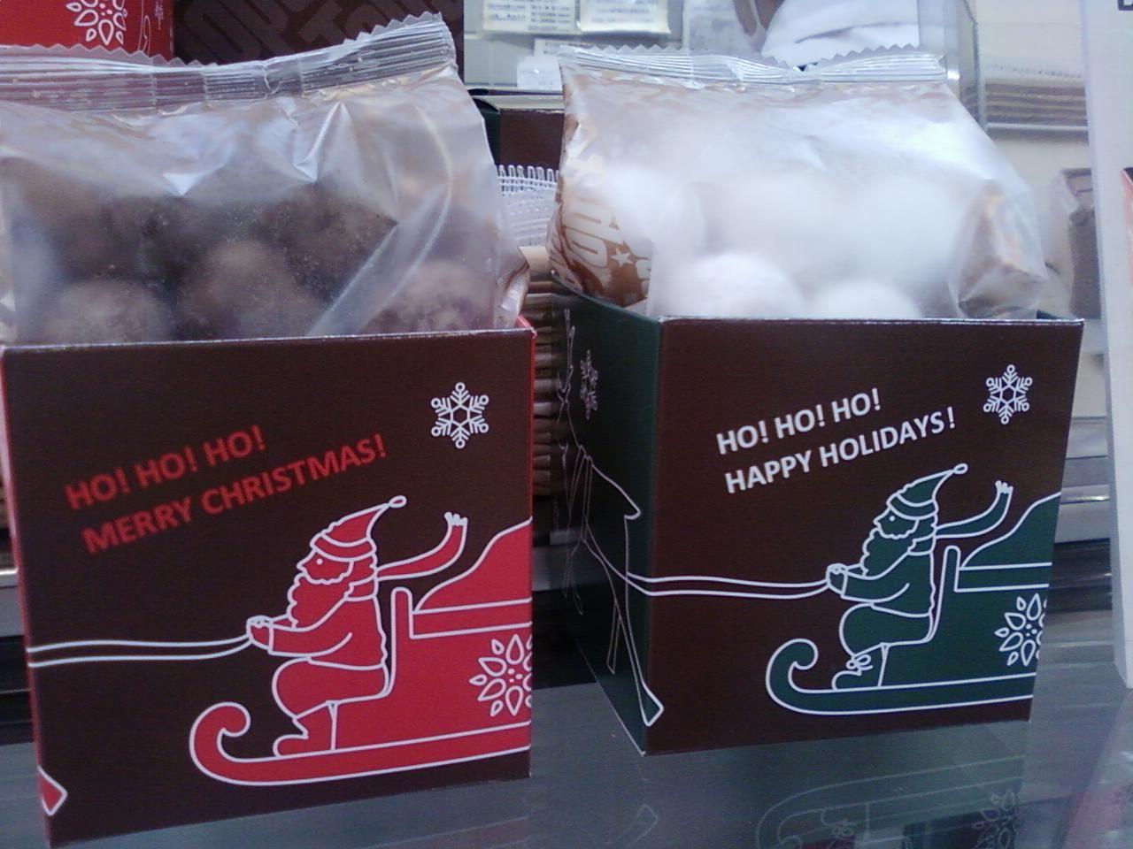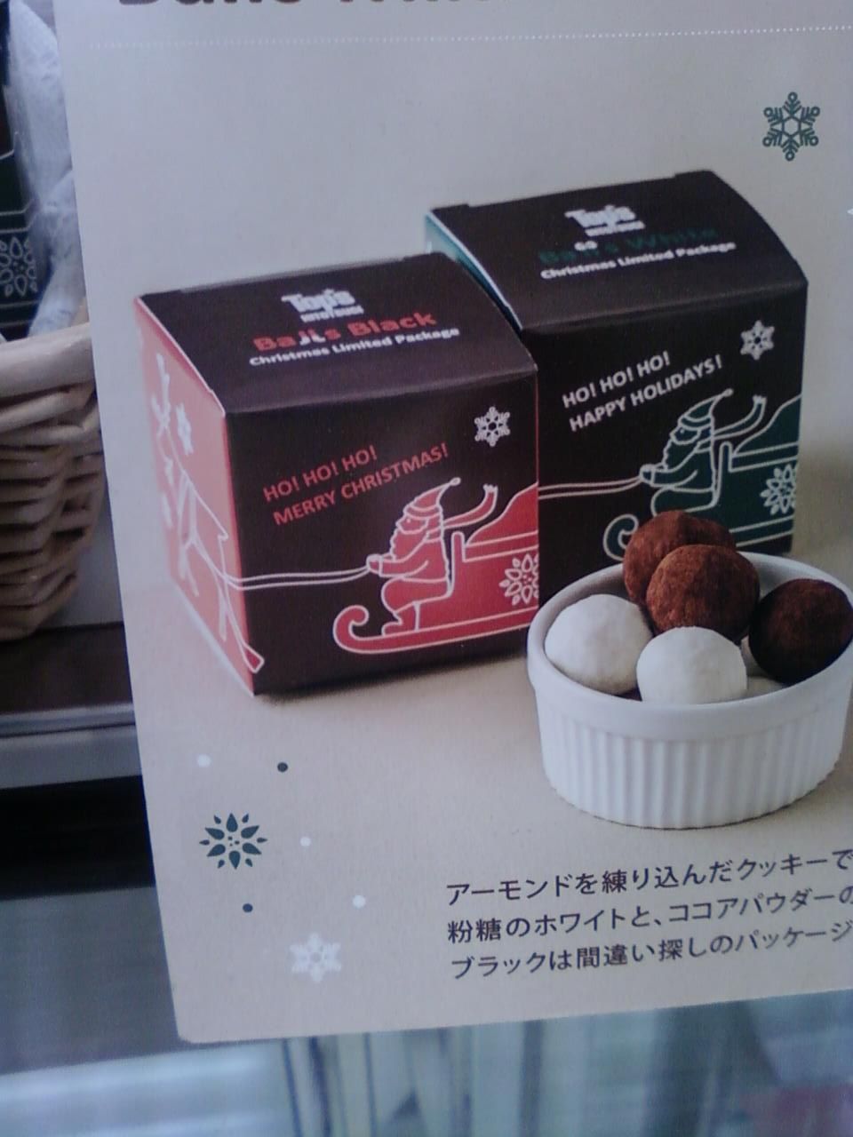 ここのトップスさんは、JR立川駅から二分くらい、伊勢丹百貨店立川の地下一階にあります。チョコレートケーキなどが定番ですが、クリスマス用のかわいらしいクッキーも売っていました。ココアパウダーと粉糖があって、ホワイトのほうは雪のようにきれいです。お手軽で日持ちもしますし、プレゼントにいいですね。