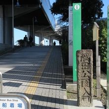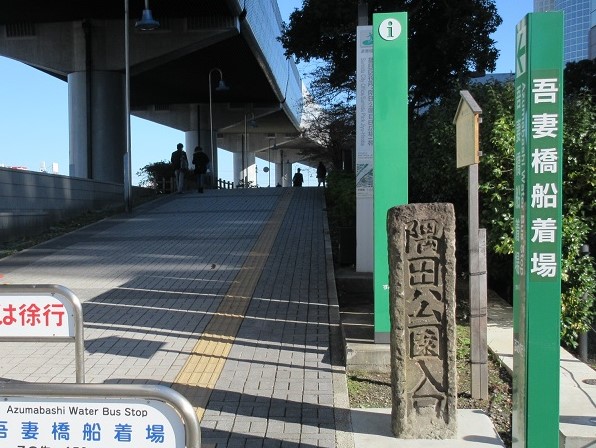 浅草から吾妻橋を渡った墨田区側に「墨田公園入口」という時代を感じさせる石造標柱がたっていました。墨田公園も非常に広いので、こちらは南の端といって良いでしょう。現在公園の中心となっているのは北小間側を北側に渡ったあたりかと。ただ、隅田川の舟付き場に近いので、隅田川の景観を楽しむという意味ではこちらが目印になると思います。