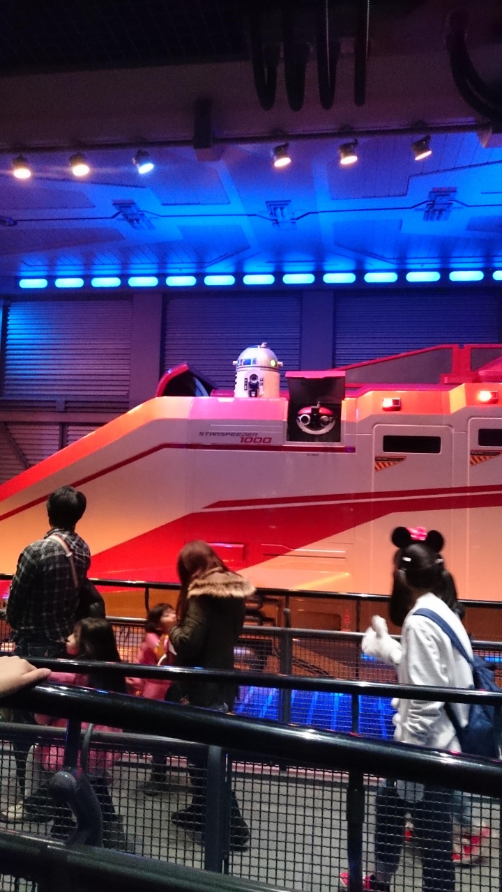 スターツアーズはスター・ウォーズの世界です。並ぶ場所に、スター・ウォーズ関連のものがたくさんあります。R2D2や乗り物が居たりしました。