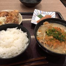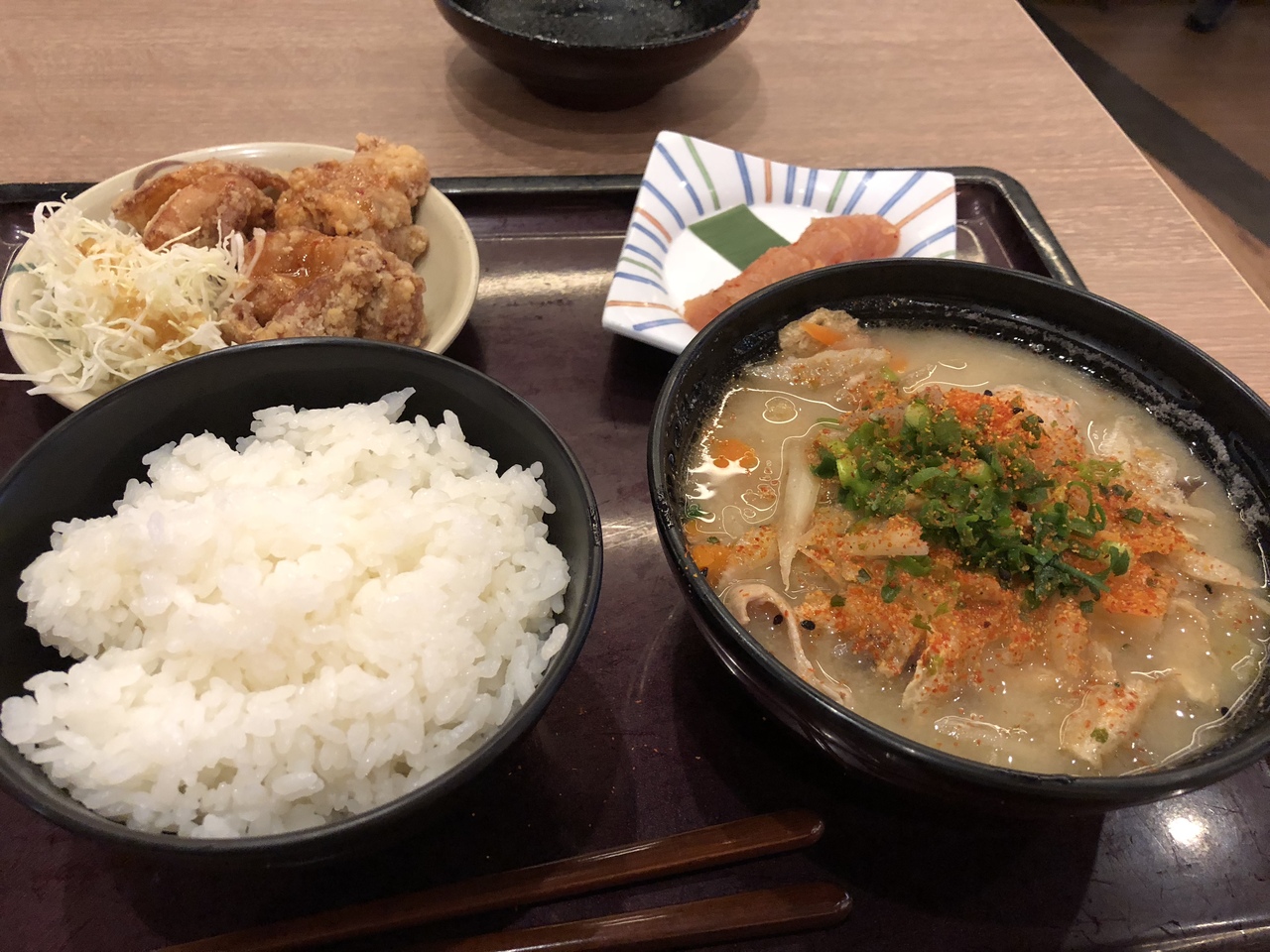 夕食で利用しました。定食セットが740円で、ご飯、具だくさんの豚汁、明太子がついてきます。追加で鳥の唐揚げを注文しました。明太子がご飯に合う味付けで美味しかったです。豚汁も甘めの白味噌が良い味付けでした。鳥の唐揚げが普通だったので、いわし明太を頼めばよかったと思いました。