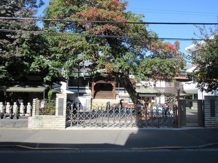 谷中を散策して三崎坂の坂に沿って歩いていた際に立ち寄ったお寺です。保育園が横にあり、境内の写真をとるのがはばかられまして、写真は少し離れたところから一枚写しました。門前にはお地蔵さんが何体も並んでいて保育園で元気に遊ぶ園児らを見守っているようでした。