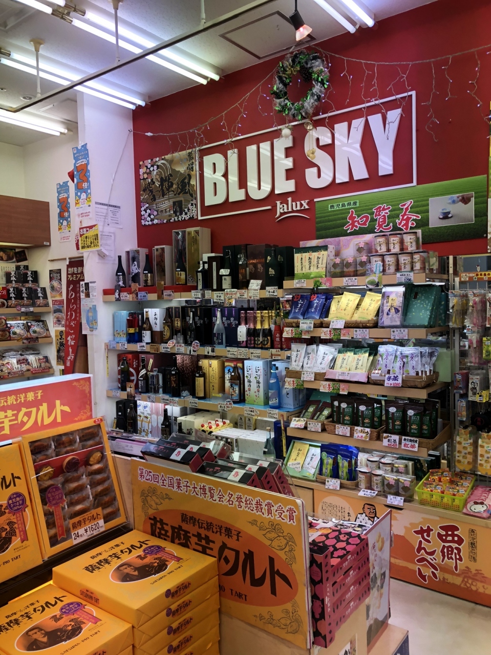 日本航空系列の土産物店で鹿児島空港内にあります。鹿児島名物のサツマイモを主原料とした焼酎の試飲ができて、良い買い物ができました。鹿児島限定の焼酎も何本かあり、買い物のし甲斐がありました。さつま揚げやサツマイモを使ったおまんじゅうなどのお土産も多く売られていました。