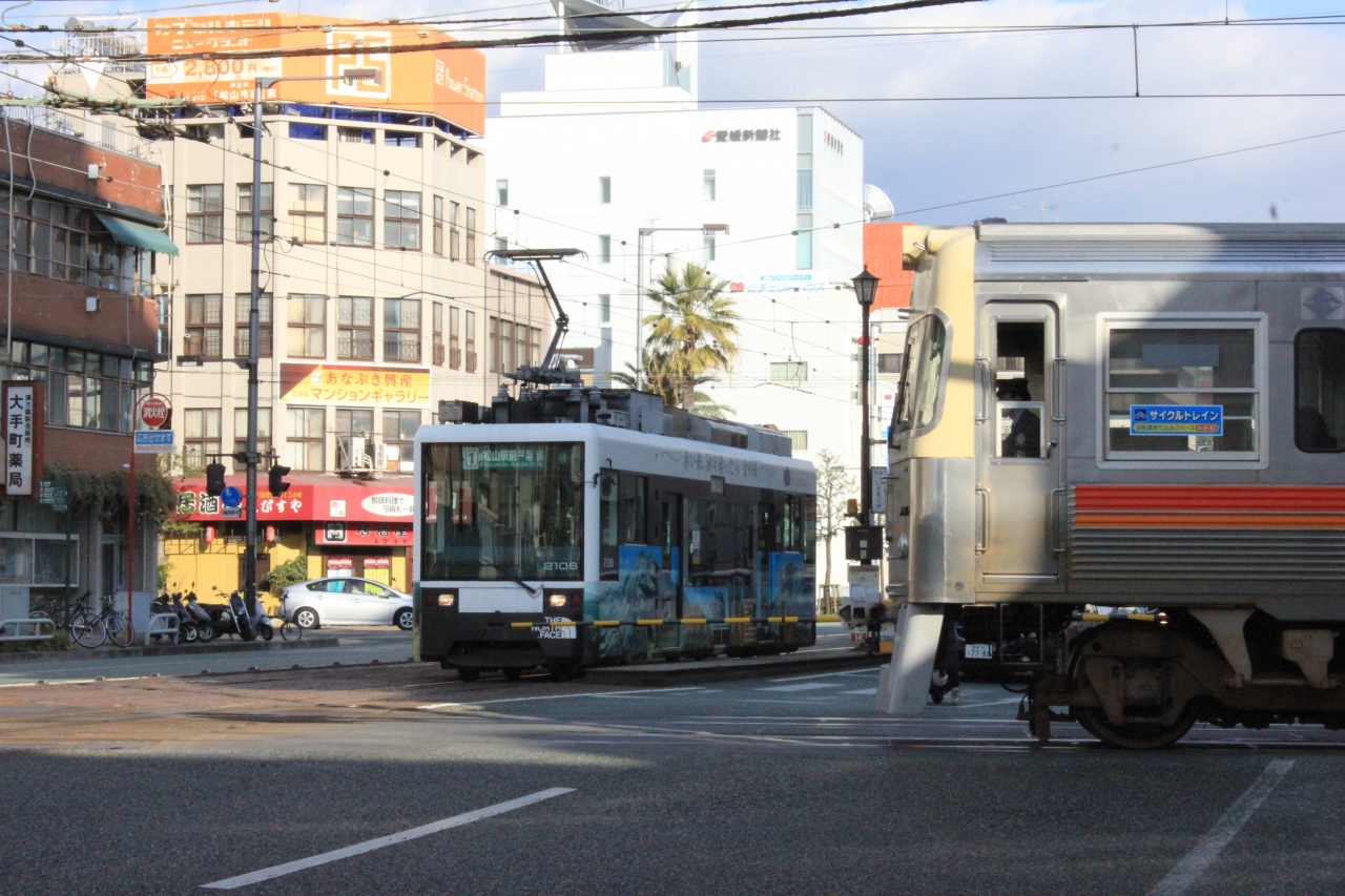 同じ伊予鉄道(郊外線)と平面交差することがあり、タイミングがよければ電車同士が90度の角度で待っている瞬間を見ることができます。