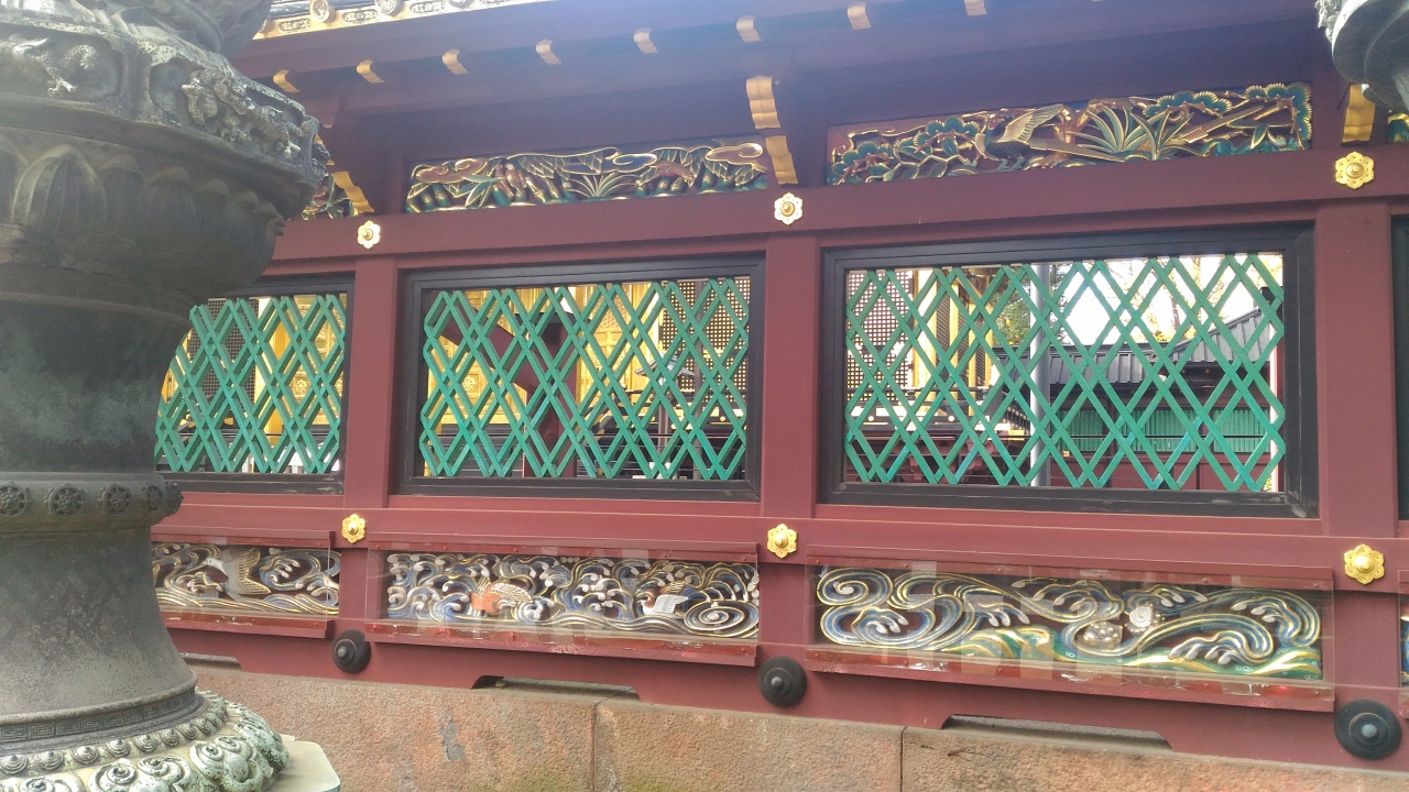 参詣道突き当りの唐門の左右にある塀がそれにあたります。江戸時代に造営されたもので、国指定重要文化財に指定されていました。菱形の格子の向こう側が透けて見えるのでこうよばれているとのことです。動物と植物が色鮮やかに生き生きと彫られていました。