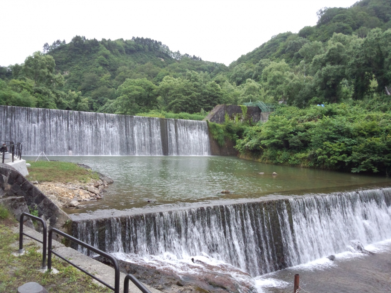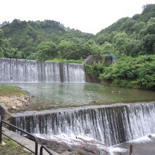 源泉や飲泉所の少し上流部分にあり、肘折温泉から徒歩で数分の所です。川の水は美しくそれなりに迫力もあります。堰堤と堰堤の間に置き竿で釣りをしている人がいました。釣れている気配はありませんでしたが、この様に景観が良い温泉街の隅でのんびり釣りとは羨ましい限りです。