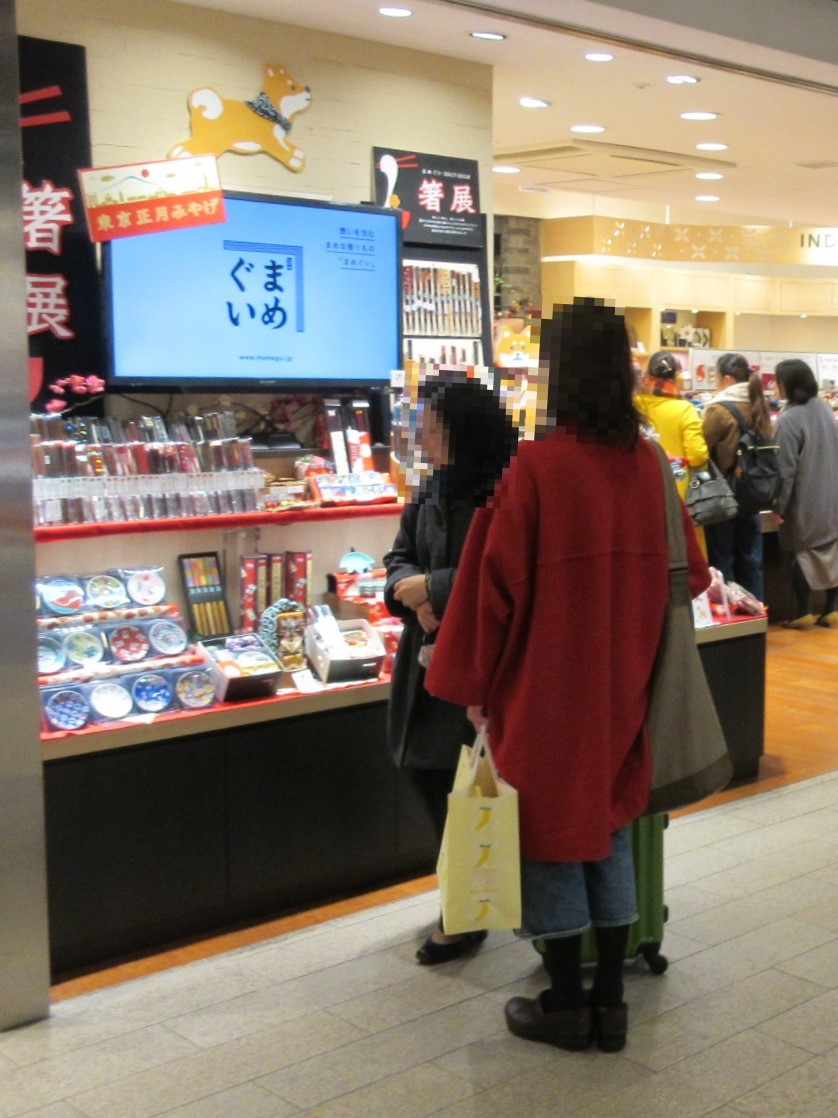 東京駅のグランスタの中に、ハンカチや小さめの風呂敷を扱うお店があって立ち寄りました。お菓子を包むと丁度犬や猫の可愛らしい顔が表に来る商品など、お土産として喜ばれそうな可愛らしさでした。どれも和のテイストでやさしい色使いで、そこはかとなく漂う昭和の香りがまた心地よいお店でした。