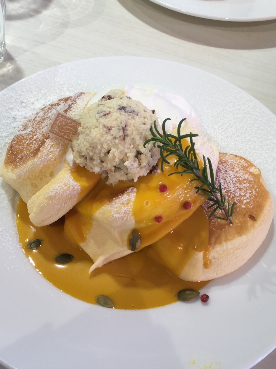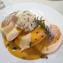 ハロウィン限定だったかぼちゃのソースがかかったパンケーキをいただきました!