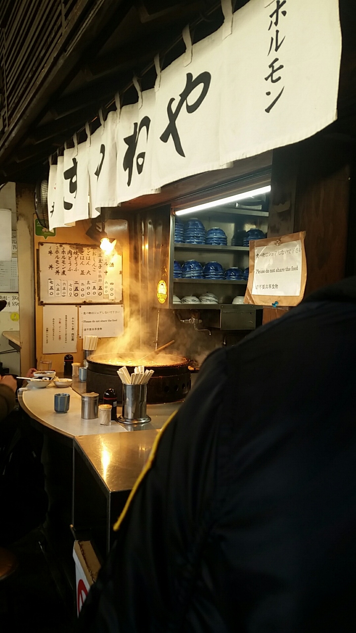ようやく順番が来たときに、店前の席が二つ空いたので、すかさず着席。5人程度しか座れないのでラッキー。座れない人は、店の前にあるテーブルにて立ち食いになります。