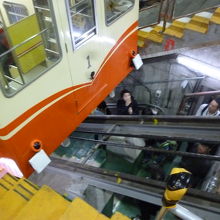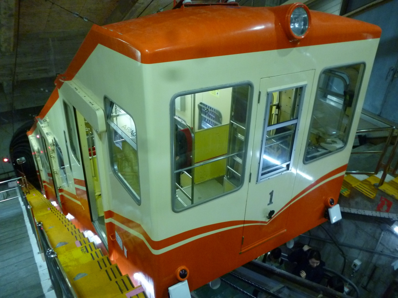 黒部ダム観光にはこれに乗らなければなりません。黒部ケーブルカー、標高1828メートルの黒部平から標高1455メートルの黒部湖に行くのに乗りました。標高差約400メートル、最大勾配31度の急斜面を走るケーブルカーです。自然保護と雪害防止から、日本で唯一の全線地下式ケーブルカーです。したがって外の景色は見えません。このケーブルカーは開業時以来一度も車輌を更新せず、開業当初の客車が今でも使用されています。そんなケーブルカーに乗りながら、黒部ダム建設の苦労を感じました。