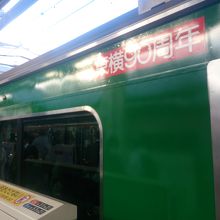 何気なく列車を待っていたらホームに滑り込んできたのは青ガエル。