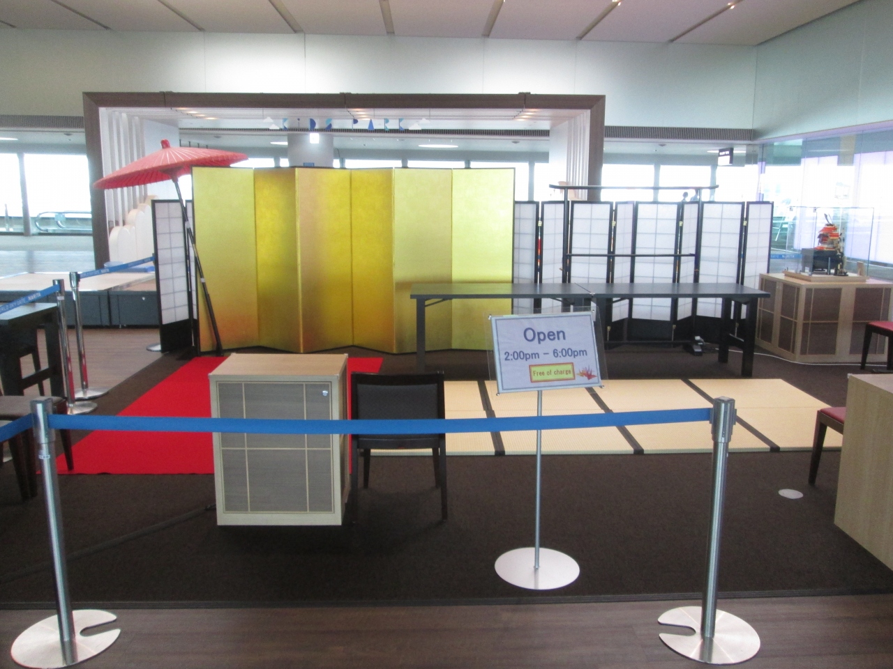 かつて成田空港第2ターミナルの本館とサテライトを結んでいたシャトルトレインの跡地を使って休憩場所を設置していました。特に、畳に屏風が置かれた和の休憩室があったのが良かったです。また、このエリアはガラス張りのため、見晴らしが良く駐機している機体が見れました。