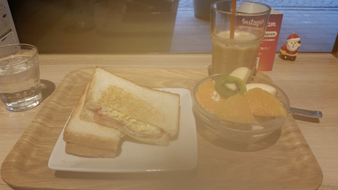 おやつを食べに行きました。イムズのB1にあるフルーツショップです。平日は15時までがランチタイム。今回はミックスッサンドをオーダー。卵とハムとトマトのホットサンド2切れと、フルーツ、飲み物で780円。美味しいです。