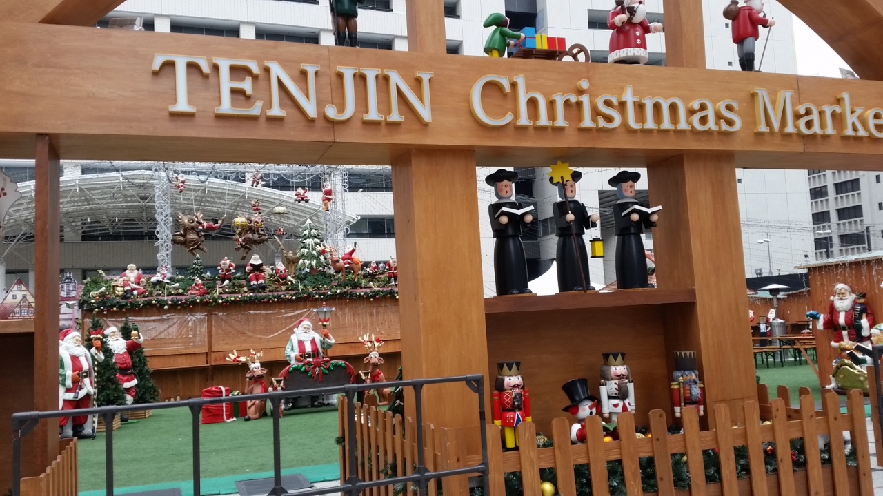 大丸の裏手にある市役所前の広場です。昼間でしたので、お店はオープンしておらず、サンタクロースや牧師などの人形が並んでいるだけでした。が、夜になると、博多駅前のようにクリスマスマーケットが開催されて賑やかになると思老います。