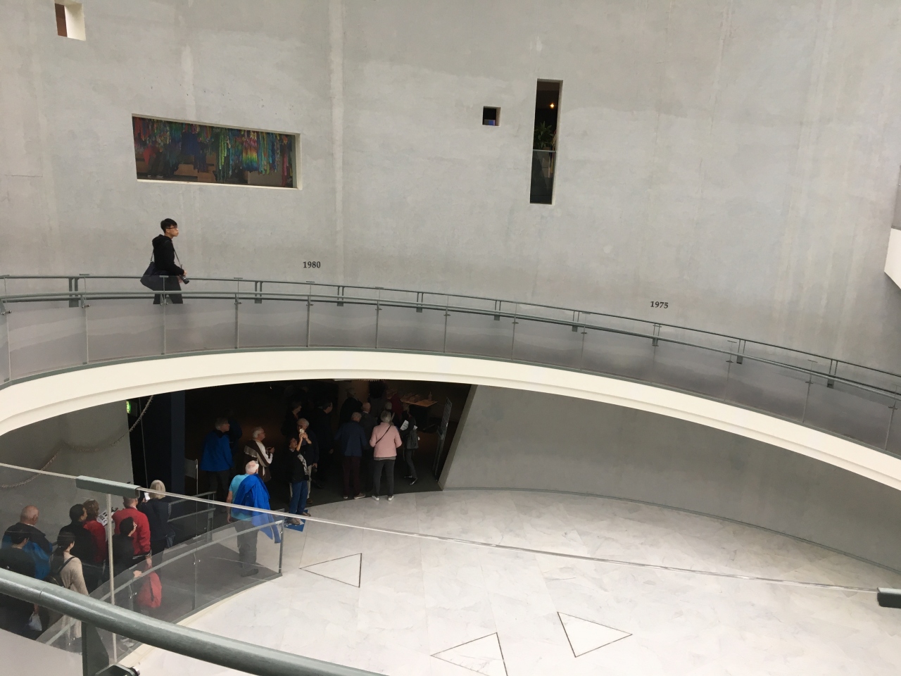 円柱の白い壁ずたいに、年表が書いてあり 現在かららせん状に降りて行き