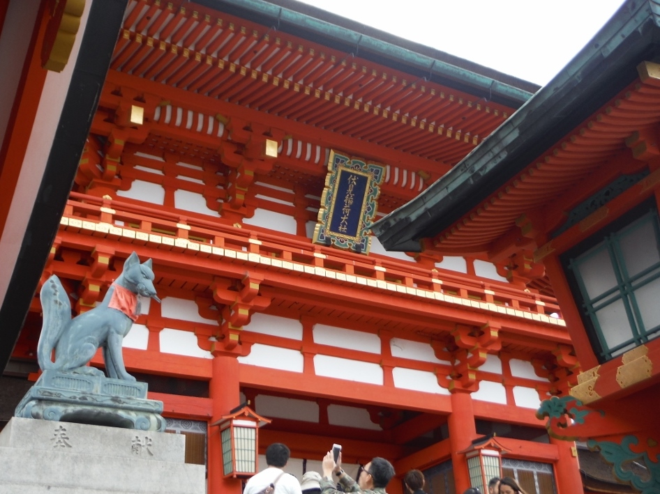 伏見稲荷大社前の大きな赤い鳥居をくぐったら朱色の立派な楼門があります。豊臣秀吉の造営だそうで規模も大きく、きらびやかな楼門です。入口の両脇の台座に鎮座するキツネの像も立派で目をひきます。振り返ると大鳥居も見え景色も良いです。