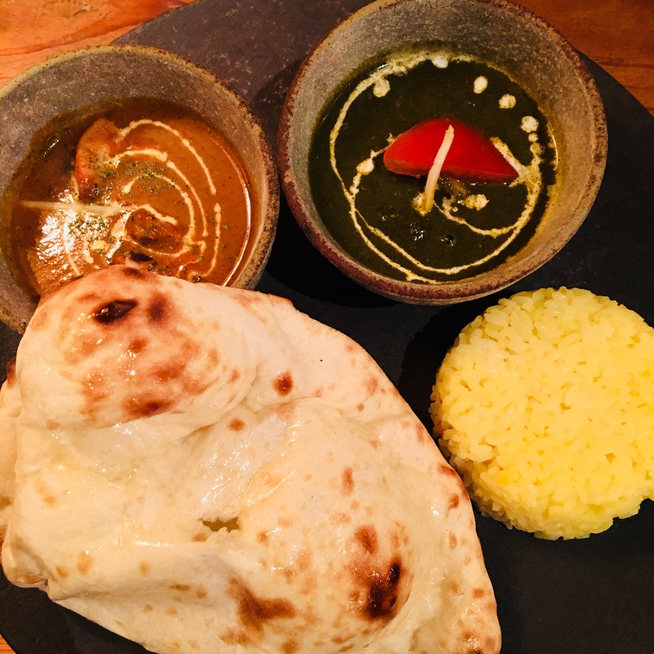 ランチでバターチキンのカレーと、ほうれん草と海老のカレー。ハーフ&ハーフで2種類楽しめるコースにしました。1,320円。