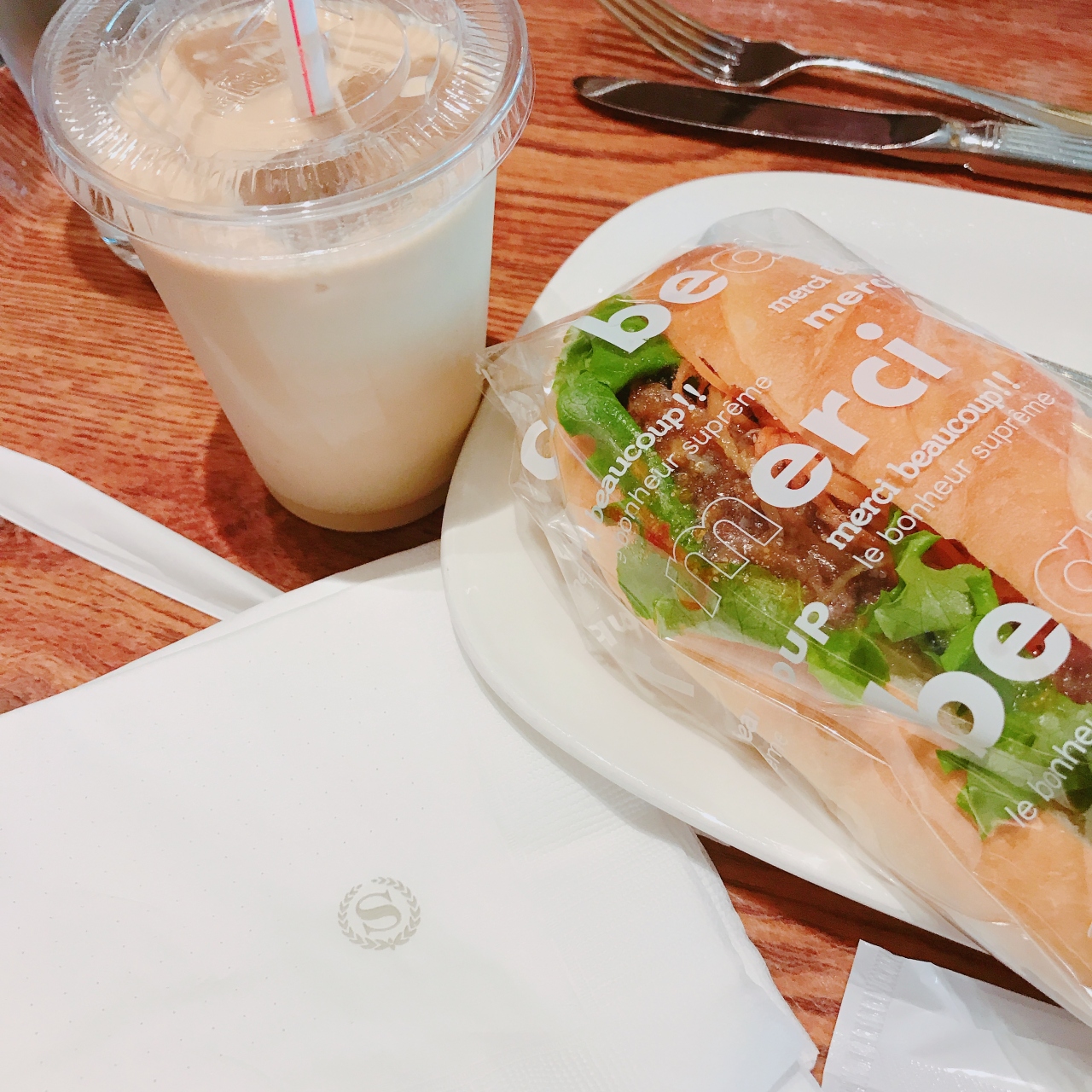 朝ごはんは1階のカフェでいただきました。サンドイッチとカフェラテで1000円とホテルにしてはふつうの価格なのがいいですね。ソファー席でゆったり過ごせました。サンドイッチもおいしくて満足です。焼き菓子なども販売していますよ。