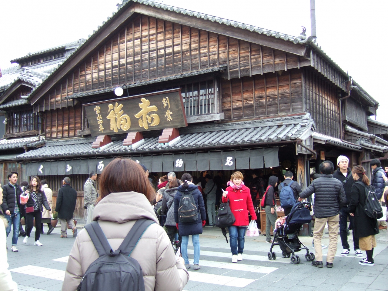 内宮からおはらい町を歩いて行くと、おかげ横丁の入り口向かいにあります。歴史を感じさせる建物で、中で赤福とお茶を楽しむこともできます。お土産を買いに寄りましたが、大きな折詰だけでなく、2個入りもあり、手軽に買うことができます。