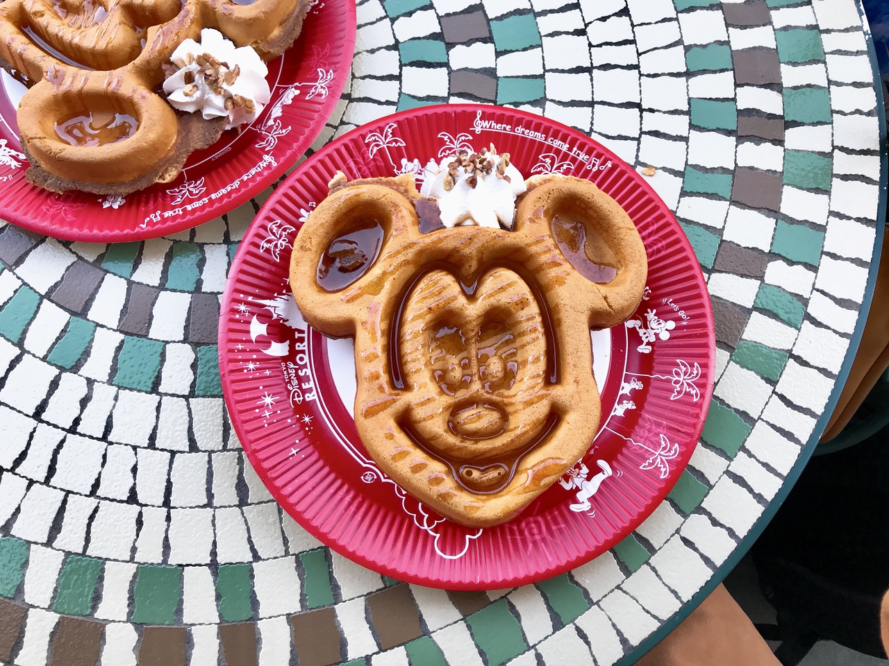 グレイトアメリカンワッフルカンパニーでインスタ映えすると言われるミッキーの形をしたワッフルを購入。店の前には長蛇の列ができ、30弱並んだと思われる。