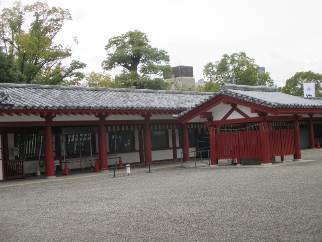 西重門に料金所があり、ここで300円を払うと、講堂・金堂・五重塔があるエリアに入れます。回廊は、この有料エリアの内側を、グルっと取り囲んでおり、赤紫の柱に黒い屋根という日本と中国の折衷式という感じがいいですね。