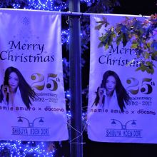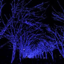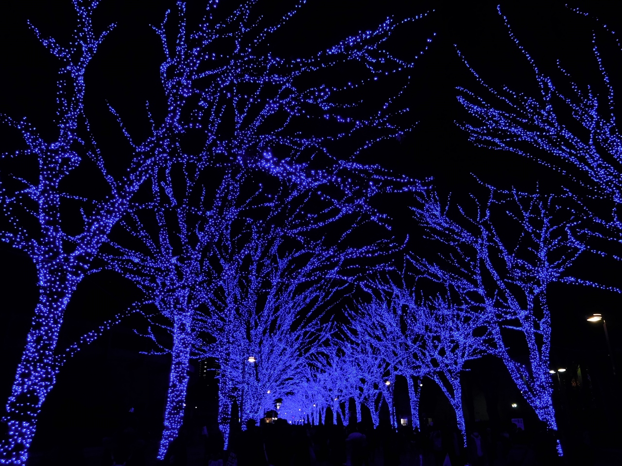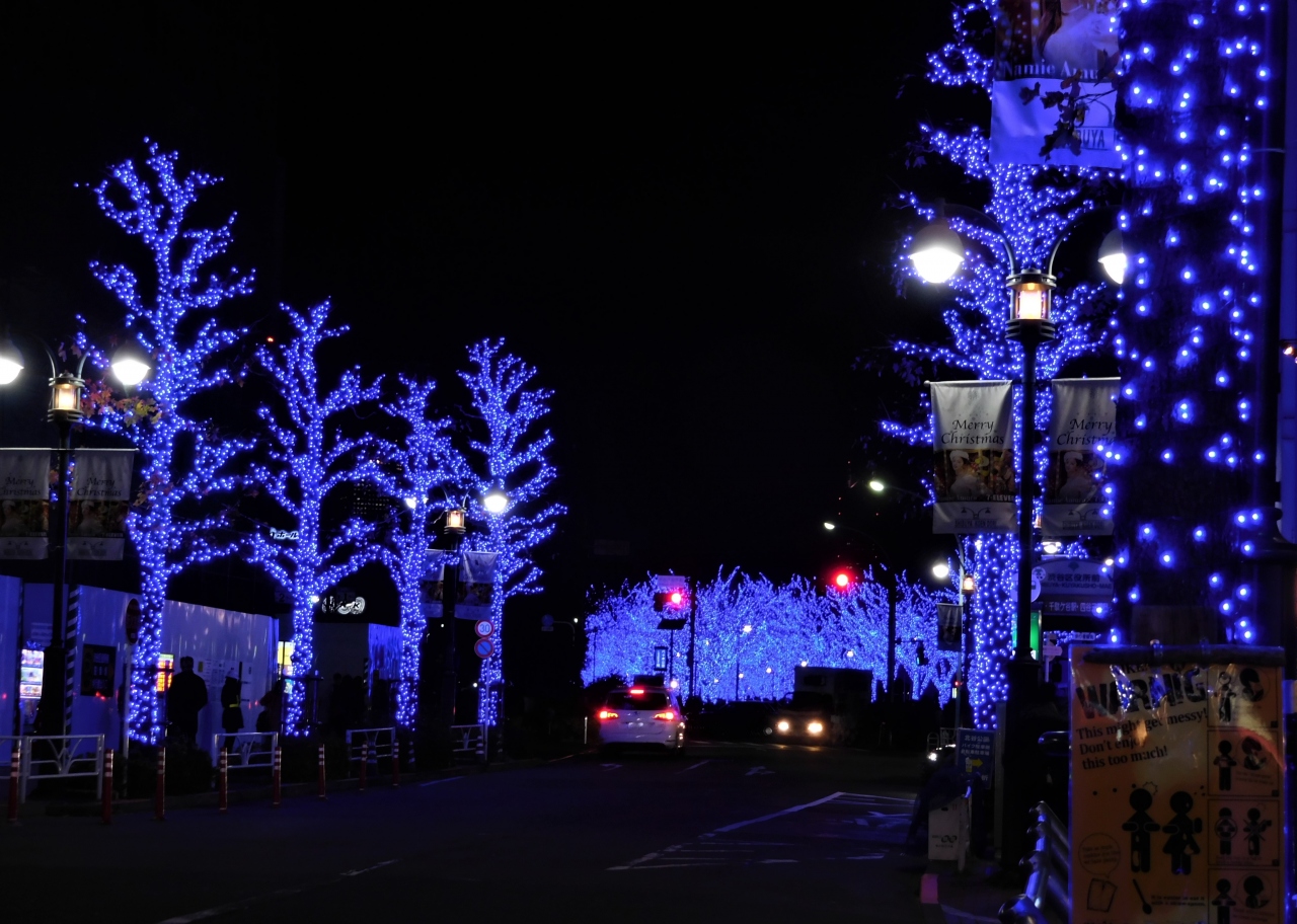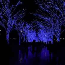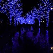 ケヤキ並木に青いライトが付いてとてもきれいです。