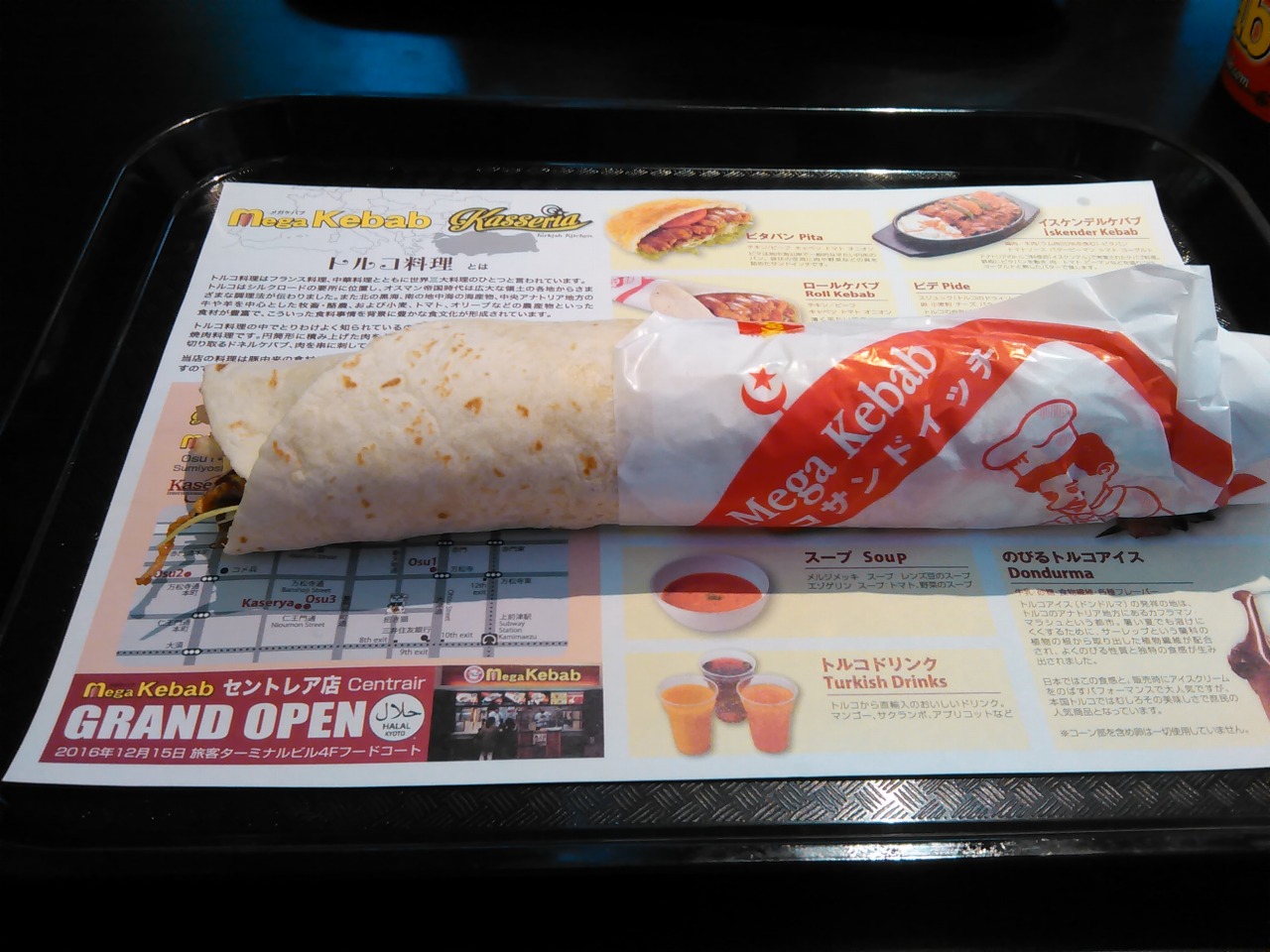 セントレア空港の新しくなったフードコート内にあります。基本的にはチキンかビーフを選び、どのような食べ方をするか選択するだけです。今回は一番食べやすそうだった ロールケバブ を選びました。見た目よりもボリュームもあり美味しかったです。